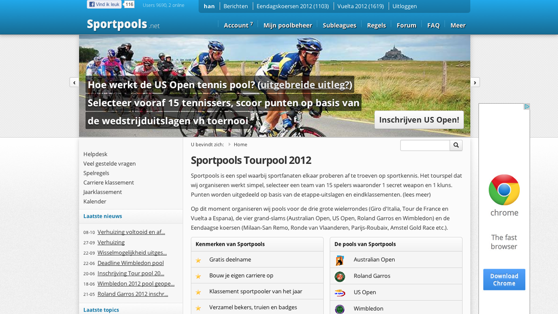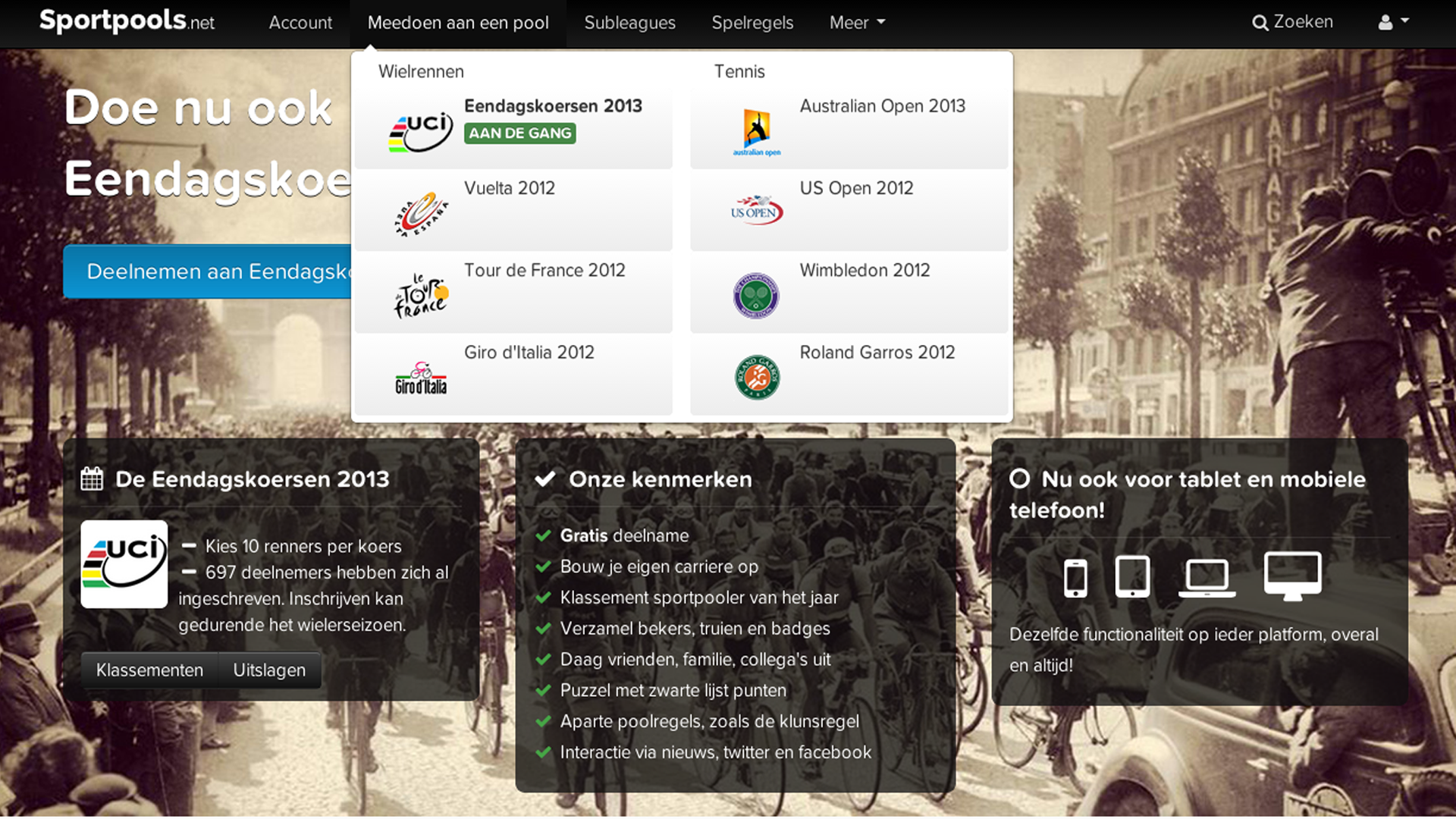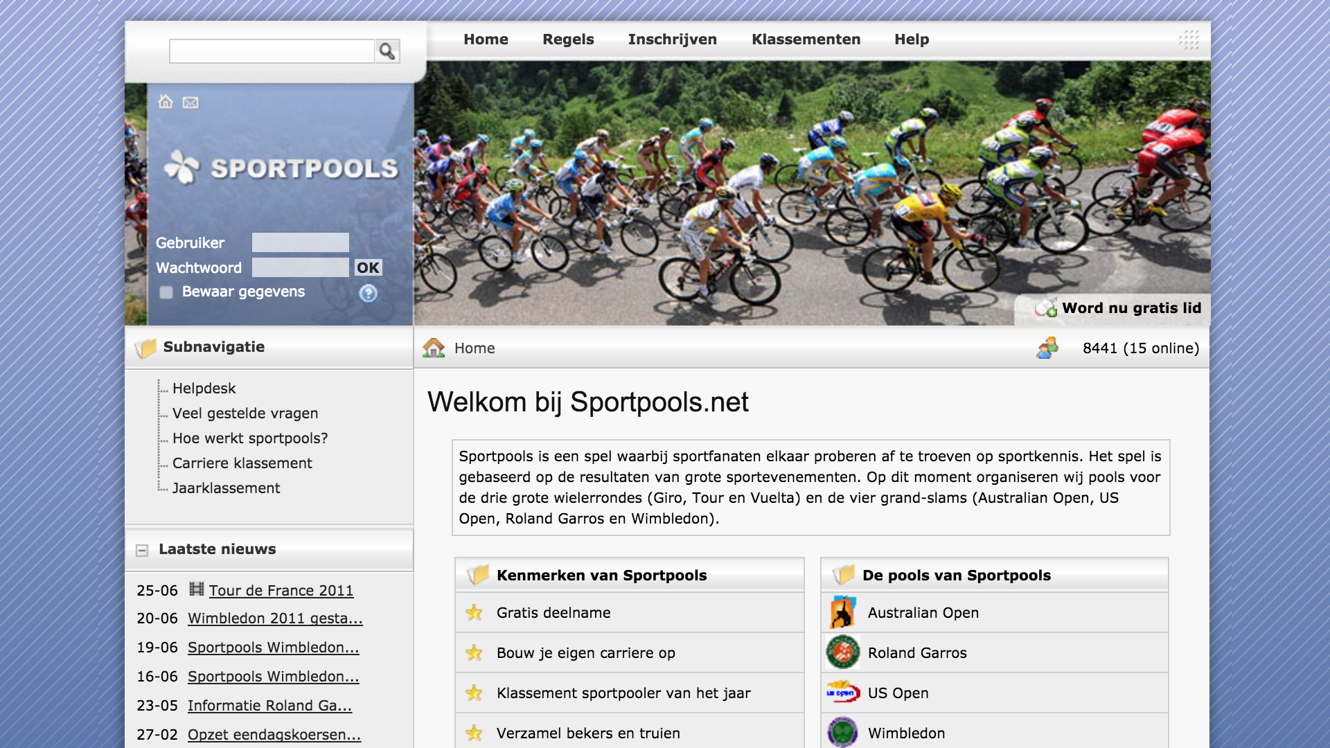 Het eerste jaar zijn we uiteraard doorgegaan met de wielerpools. In het 1e jaar van Sportpools is de tennispoule opgezet. Daarbij hebben we voor een soortgelijke opzet als bij wielrennen gekozen. Kies 13 tennissers, een kluns en een joker. De zwartelijst punten worden uitgedeeld op basis van de plaatsingslijst.